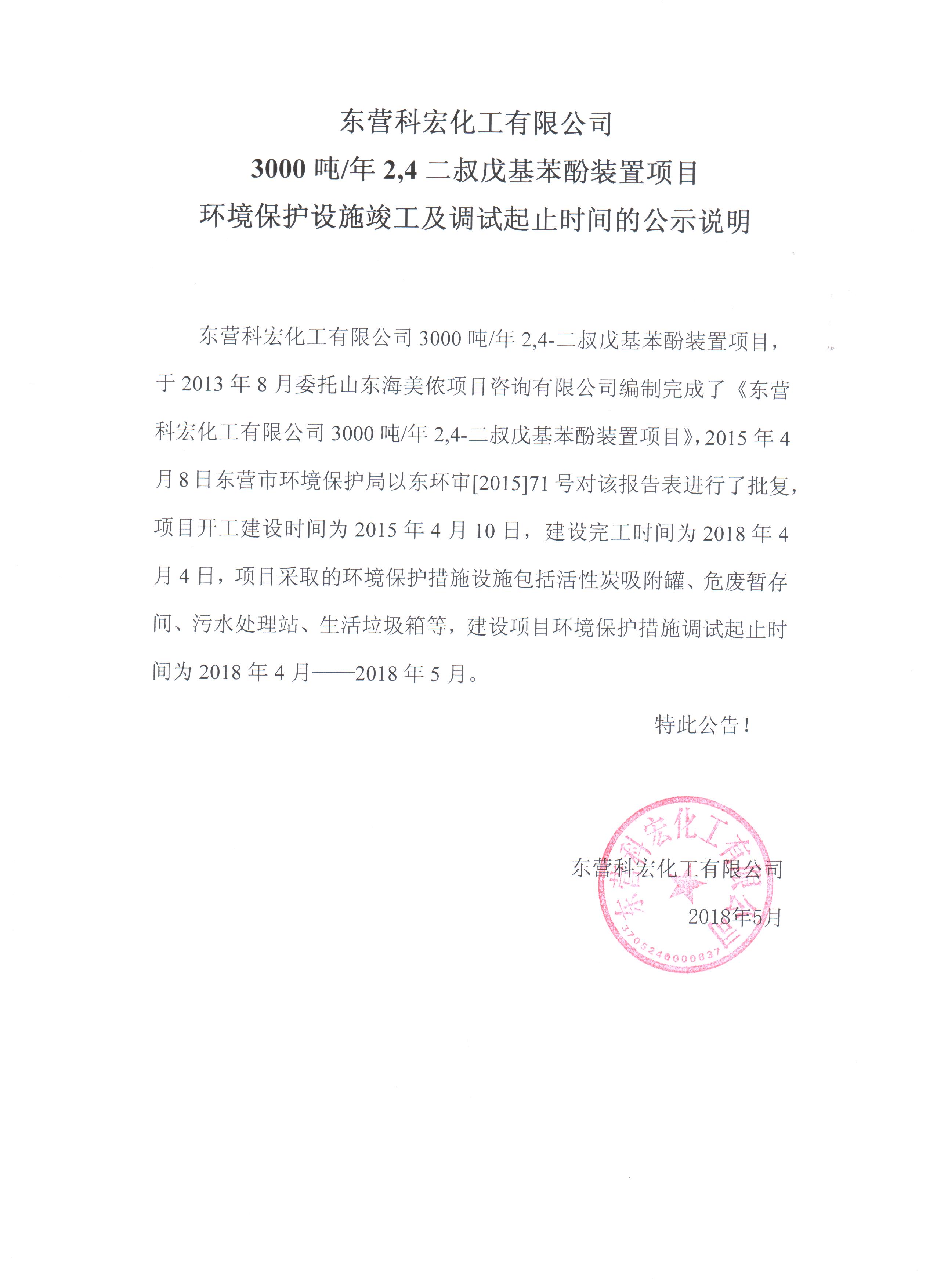 東營科宏化工有限公司3000噸/年2,4-二叔戊基苯酚裝置項(xiàng)目,于2013年8月委托山東海美儂項(xiàng)目咨詢有限公司編制完成了《東營科宏化工有限公司3000噸/年2,4-二叔戊基苯酚裝置項(xiàng)目》,2015年4月8日東營市環(huán)境保護(hù)局以東環(huán)審[2015]71號對該報(bào)告表進(jìn)行了批復(fù),項(xiàng)目開工建設(shè)時(shí)間為2015年4月10日,建設(shè)完工時(shí)間為2018年4月4日,項(xiàng)目采取的環(huán)境保護(hù)措施設(shè)施包括活性炭吸附罐、危廢暫存間、污水處理站、生活垃圾箱等,建設(shè)項(xiàng)目環(huán)境保護(hù)措施調(diào)試起止時(shí)間為2018年4月——2018年5月。